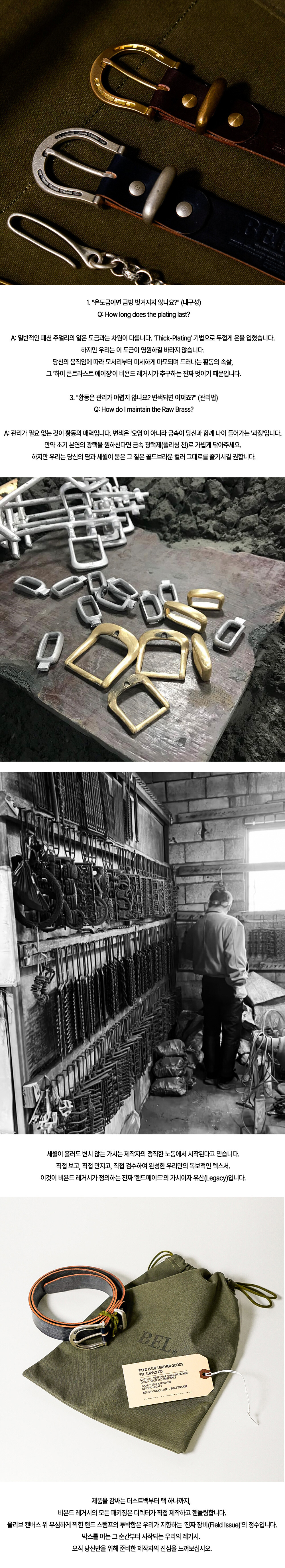 비욘드 레거시의 모든 기어는 인위적인 코팅을 걷어낸 정직한 상태의 논코팅 황동과 버니쉬 실버, 그리고 UK 브라이들 가죽을 사용하여 제작됩니다.